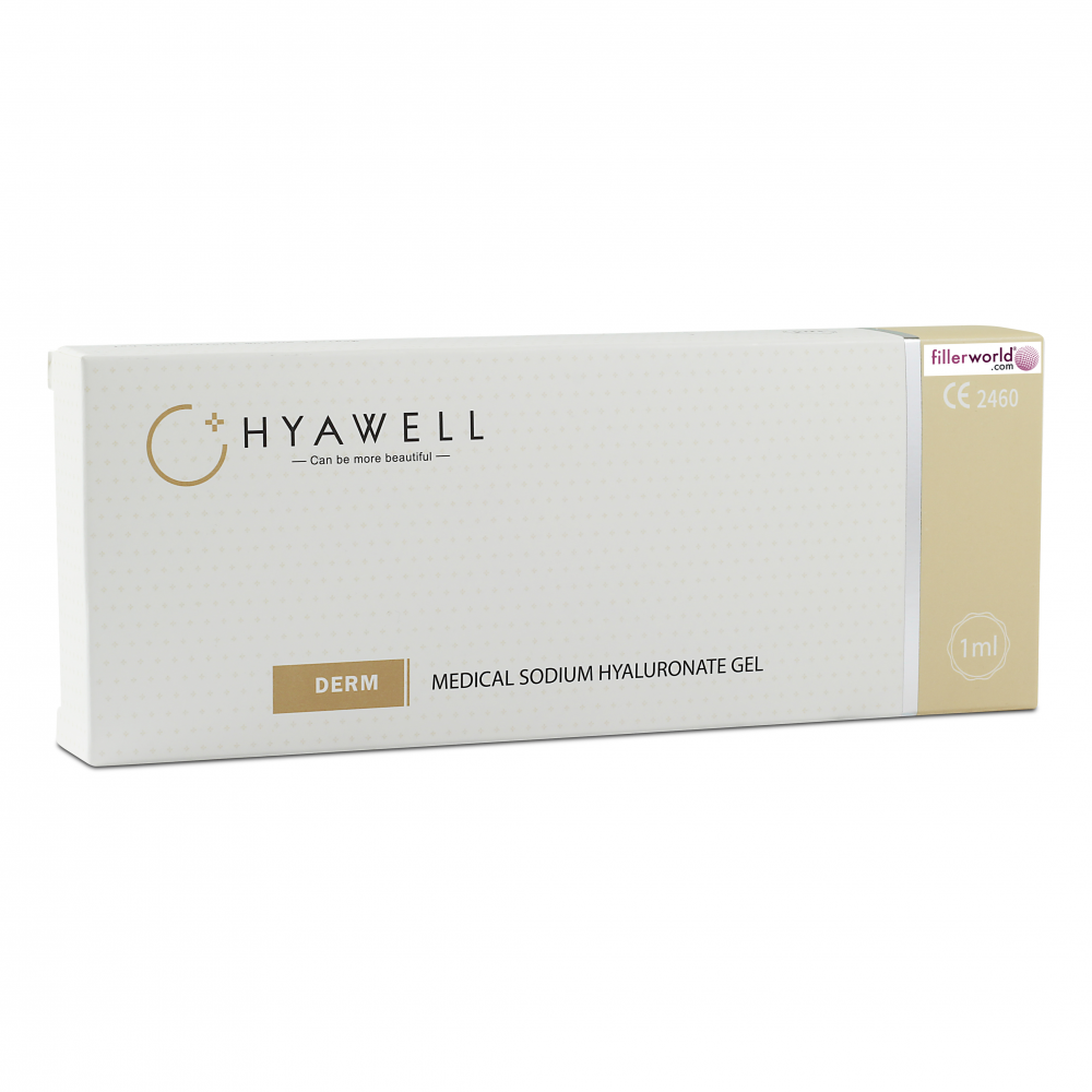Hyawell Derm The molecular network combines with water molecules to adapt, mould and integrate smoothly within the skin’s natural contours. It is used to treat aging skin folds and scars as well as volumising cheeks and lips.